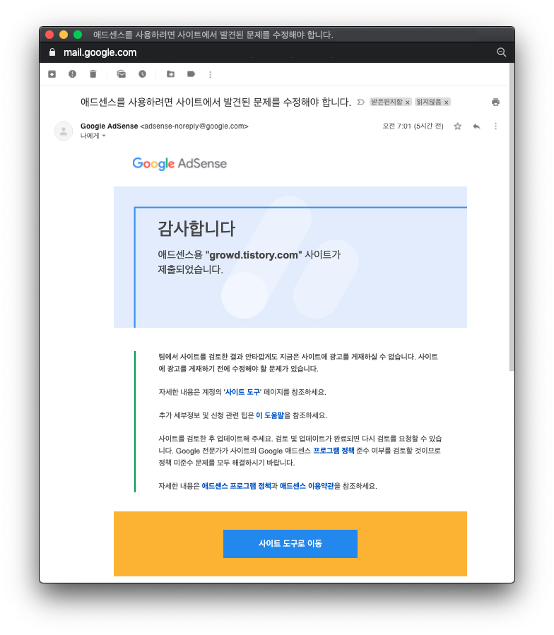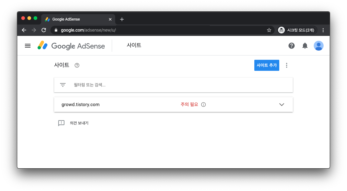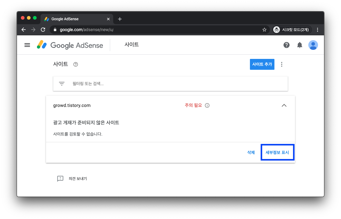 "주의 필요"를 클릭하여도 광고 게재가 준비되지 않은 사이트라는 내용만 있을 뿐 자세히 알려주지 않습니다.