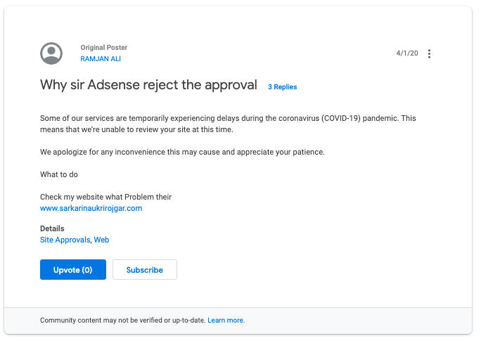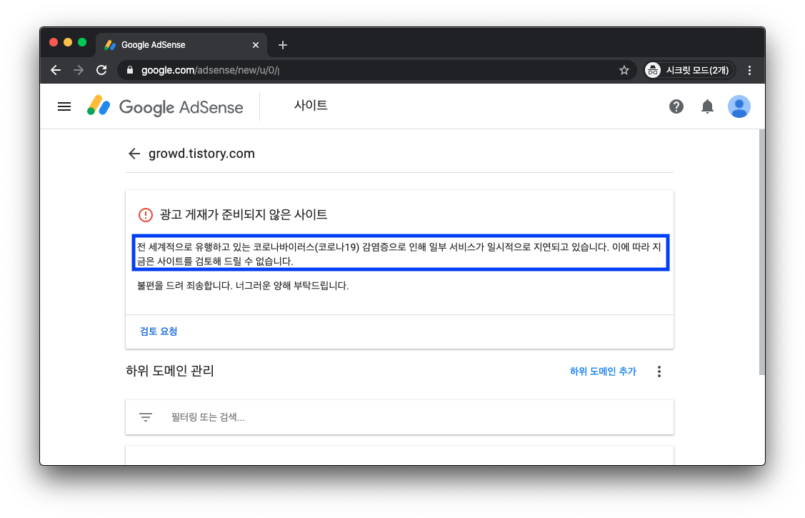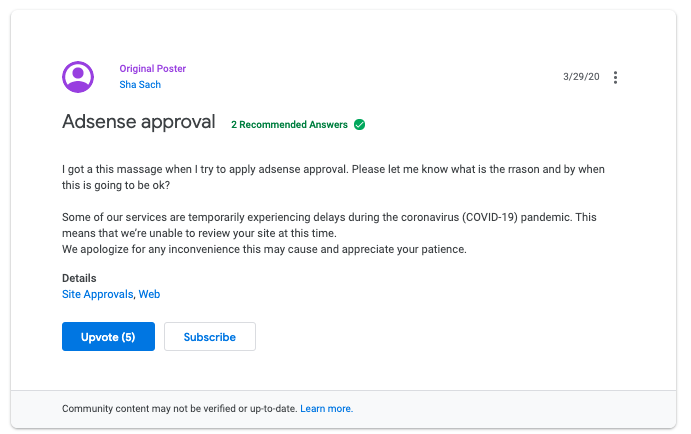 문제는 미국의 코로나 바이러스로 인해 많은 구글 측의 많은 사람들이 일하는 것이 제한되면서 현재 애드센스 심사를 할 수 없는 것이었습니다.