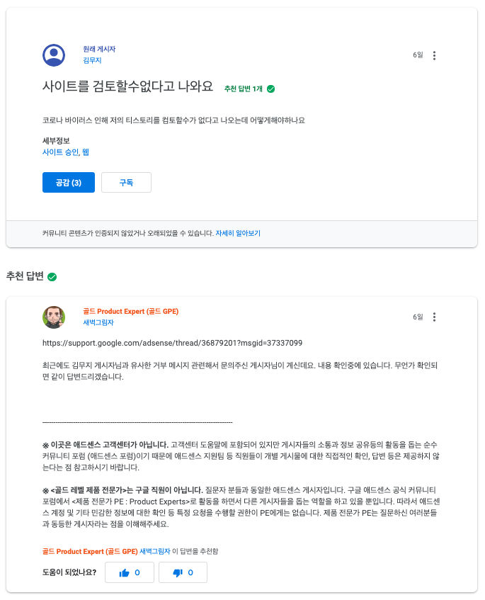 Adsense 공식커뮤니티 Product Expert라는 분들의 공통적인 의견은 "일단은 기다리면서 코로나 바이러스 사태를 지켜보자. 구글측에서 사태가 진정되면 심사 업무를 다시 시작할 것이다. 현재 재심사를 신청하는 것은 크게 다른 결과를 가져다 주지 않을 것이다" 였습니다. 하지만 이 분들도 처음 겪는 상황이고 구글측 직원이 아니다 보니 한계가 있습니다.